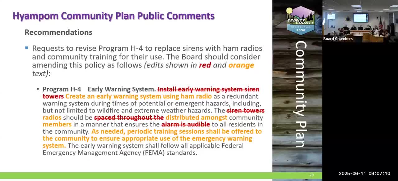 Residents press county to back community‑level emergency warnings; ham radios, FM and sirens discussed