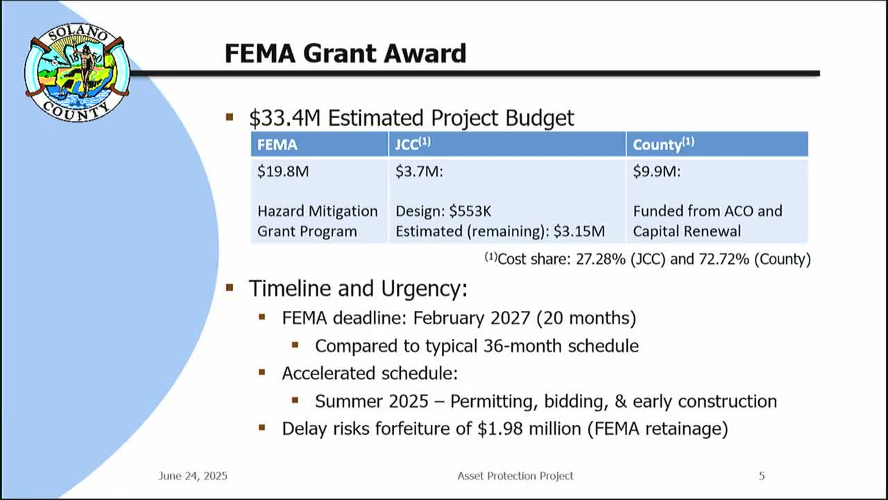 Solano County accepts $19.84 million FEMA grant for justice campus flood protections; board approves compressed schedule
