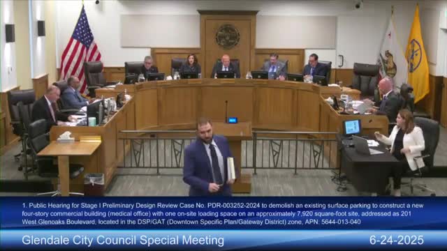 Glendale council advances stage 1 design review for four‑story medical building at 201 W. Glen Oaks Blvd.