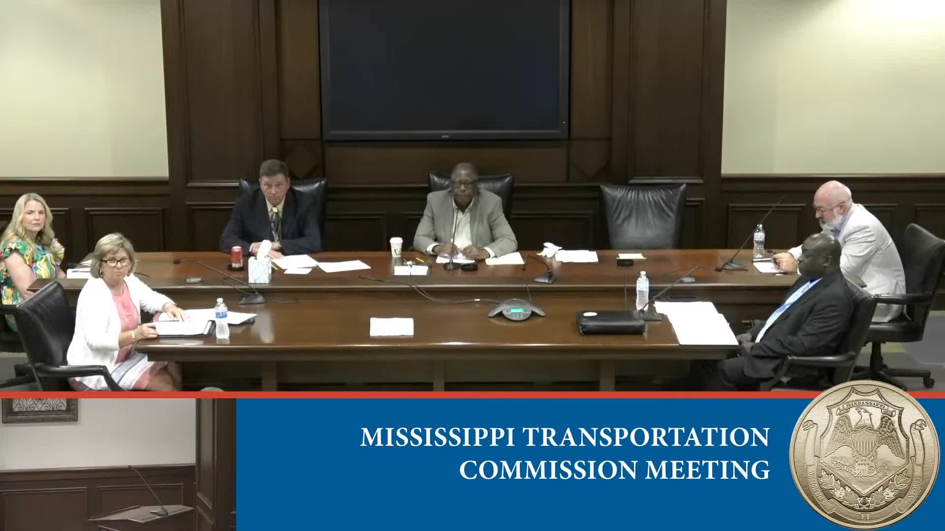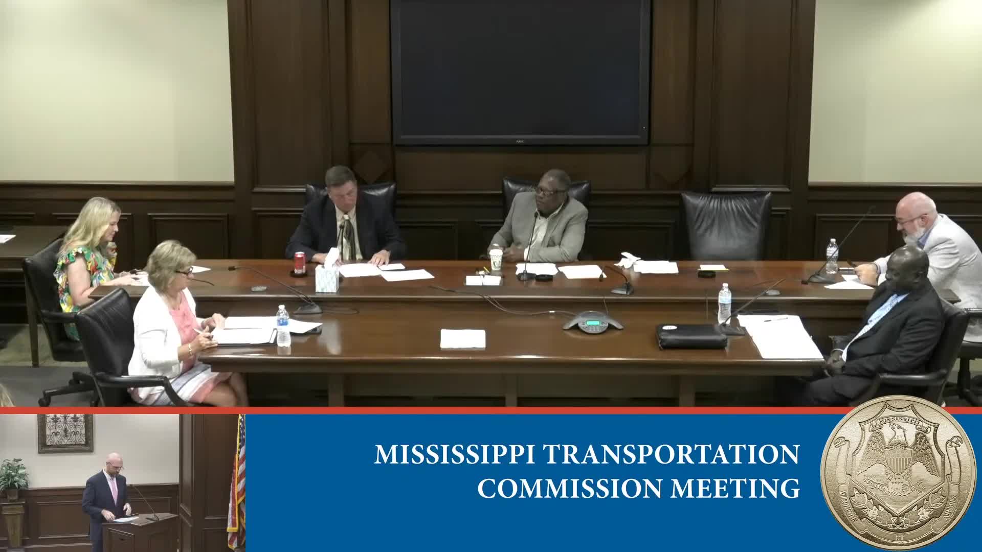 Mississippi Transportation Commission reviews contracts, property conveyances, rail and IT funding; moves into executive session on workers' compensation
