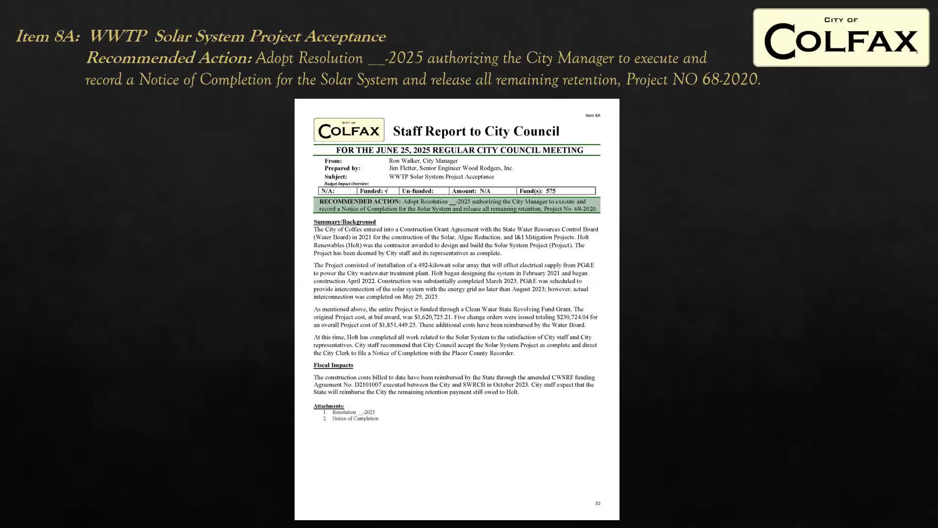 Colfax council approves solar payment conditional on PG&E permission; freezes sewer rate for next year