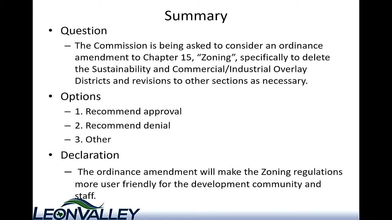 Commission recommends deleting sustainability and commercial‑industrial overlays from Zoning Code