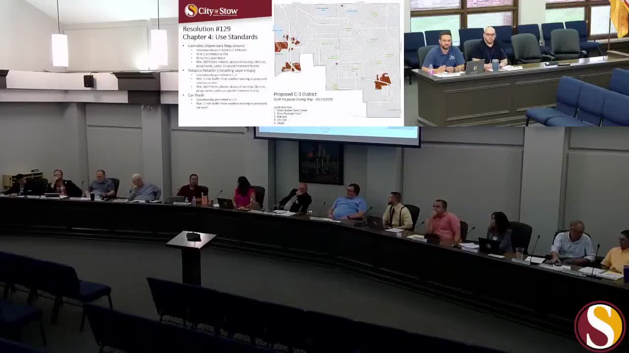 Stow planning officials push large zoning rewrite; council raises questions on dispensary buffers, lot‑size cuts and mixed‑use overlay