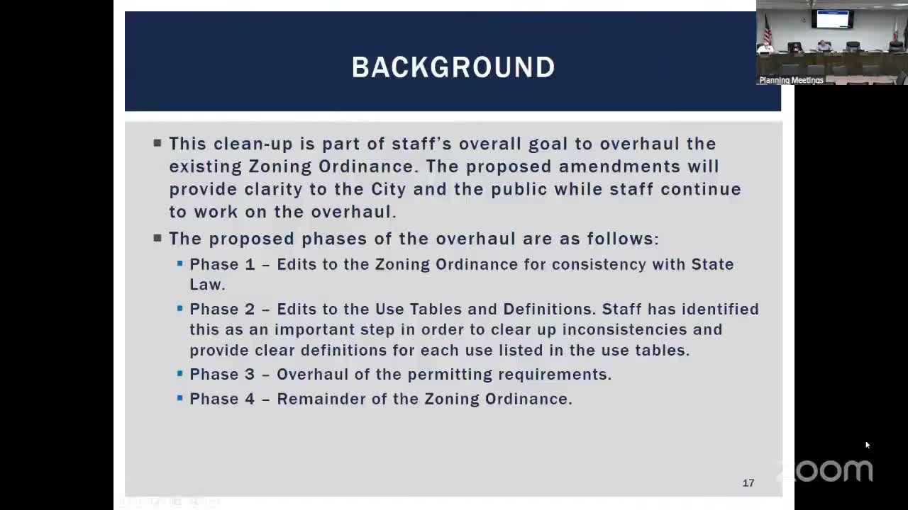 Planning staff outlines multi-phase zoning ordinance cleanup focused on use tables, ADUs and mixed-use housing requirement