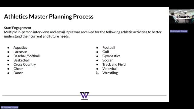 Board reviews draft athletic master plan; coaches prefer full‑size indoor turf over a smaller field