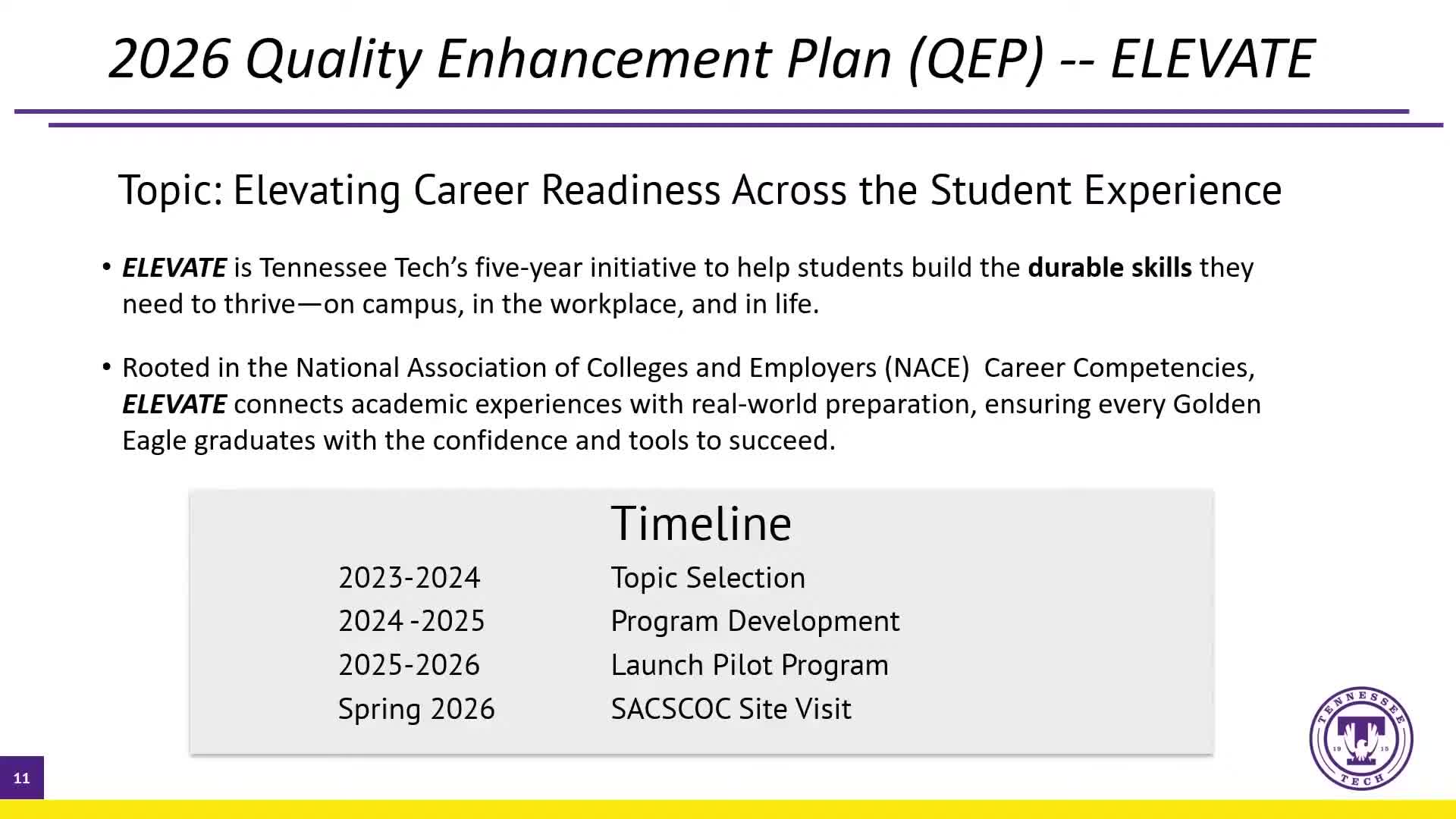 Provost outlines SACSCOC reaffirmation timeline and 'Elevate' QEP emphasizing durable skills