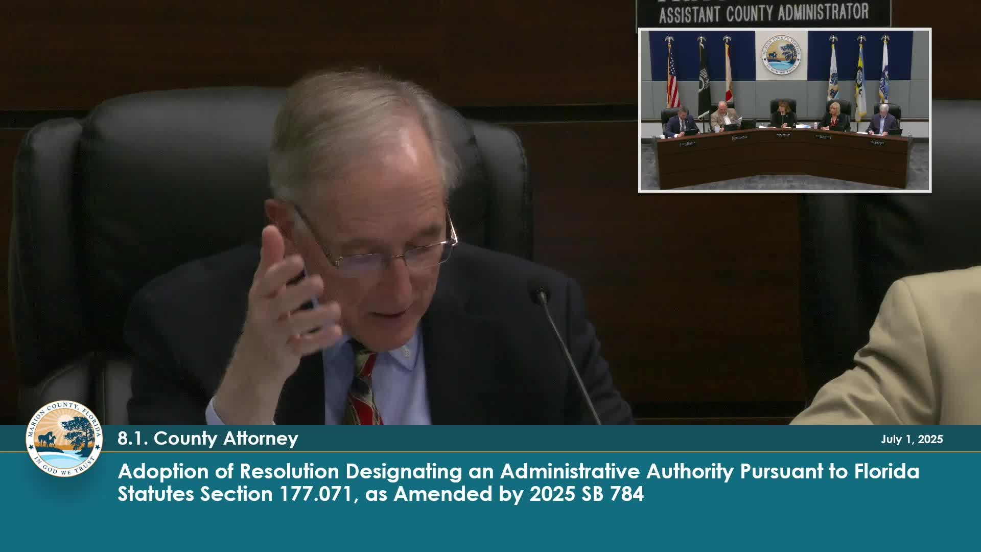 Board designates administrative authority for final plats under new state law; commissioners voice home‑rule concerns
