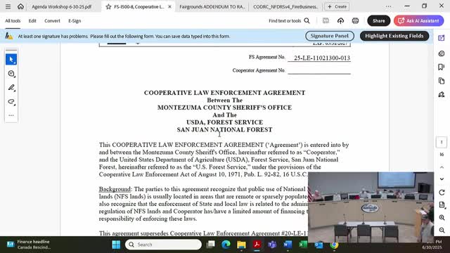 County staff describes three‑year San Juan National Forest law‑enforcement co‑op; $10,500 annual county contribution