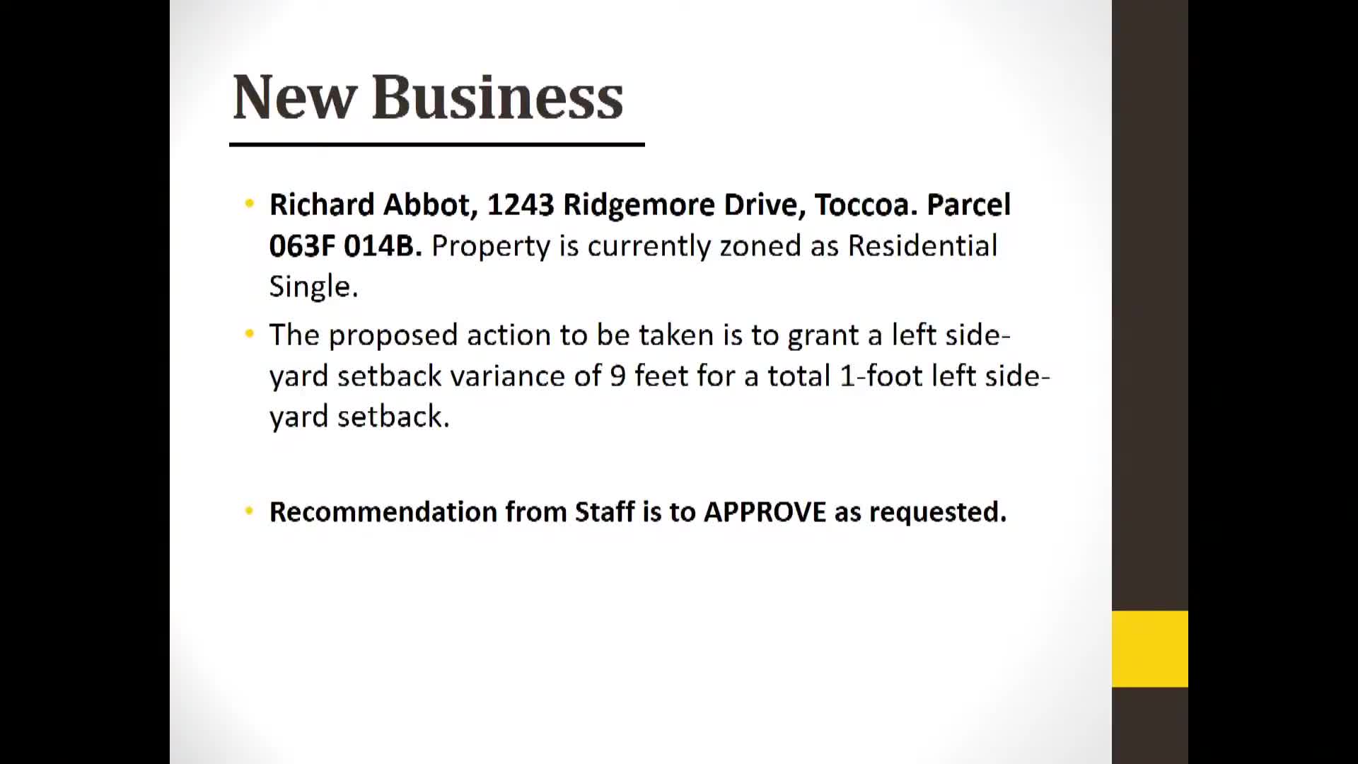 Commission recommends setback variance for Ridgemore Drive property to allow one-foot side setback for garage
