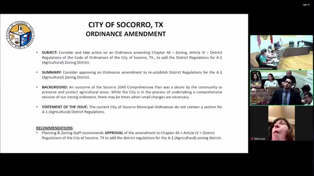 Socorro planning commission tables ordinance to restore A‑1 agricultural rules, forms committee for revisions