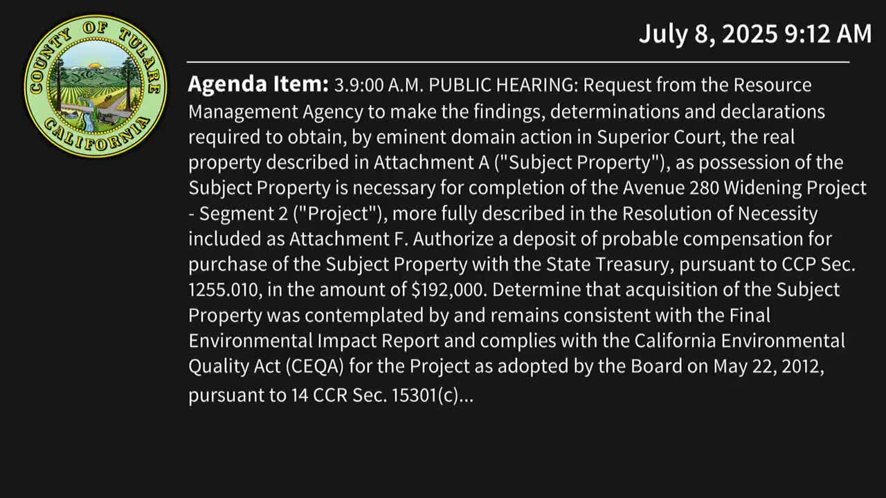 Tulare County board approves resolution of necessity to begin eminent domain for Avenue 280 widening