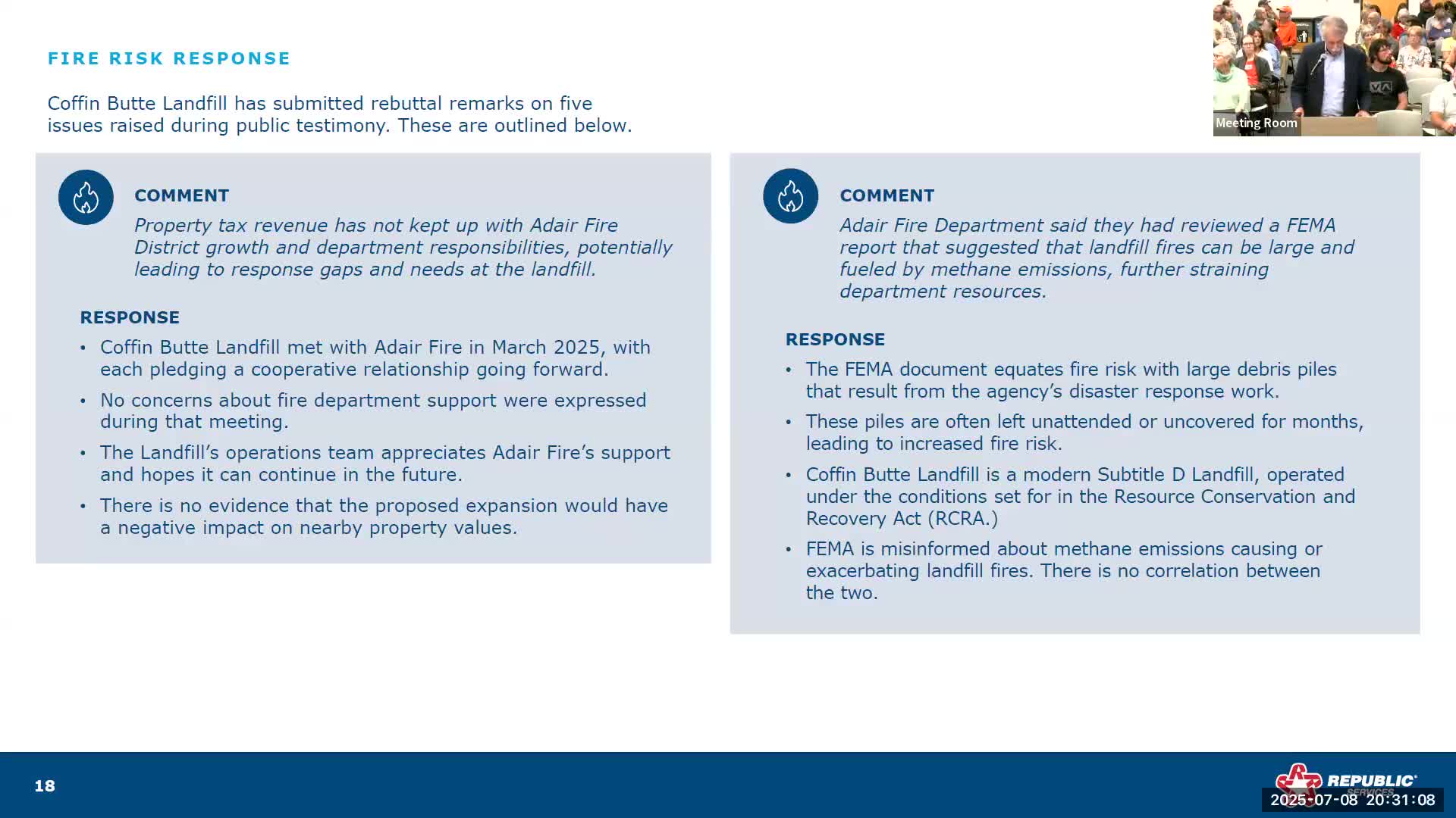 Fire risk, response and equipment reviewed; Adair Fire District concerns noted and applicant commits to improved reporting