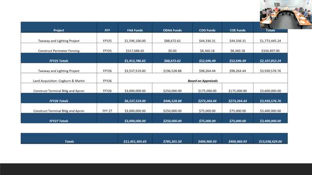 Board reviews taxiway, fence, terminal and land-acquisition funding; state and FAA funding discussed