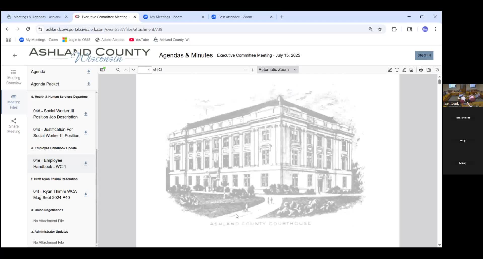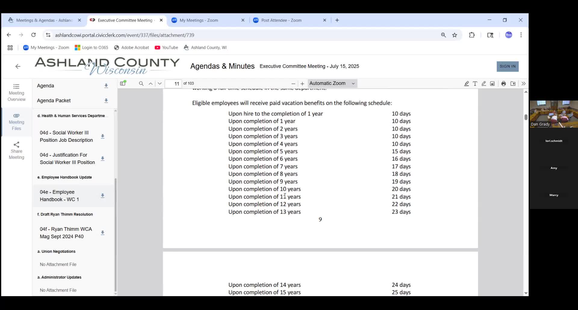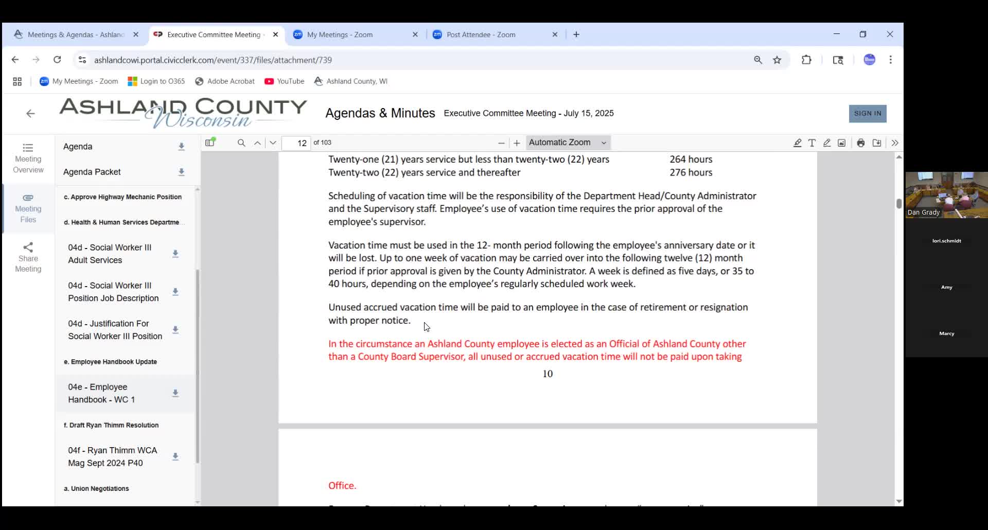 Executive Committee amends county employee handbook; vacation payout in first year clarified