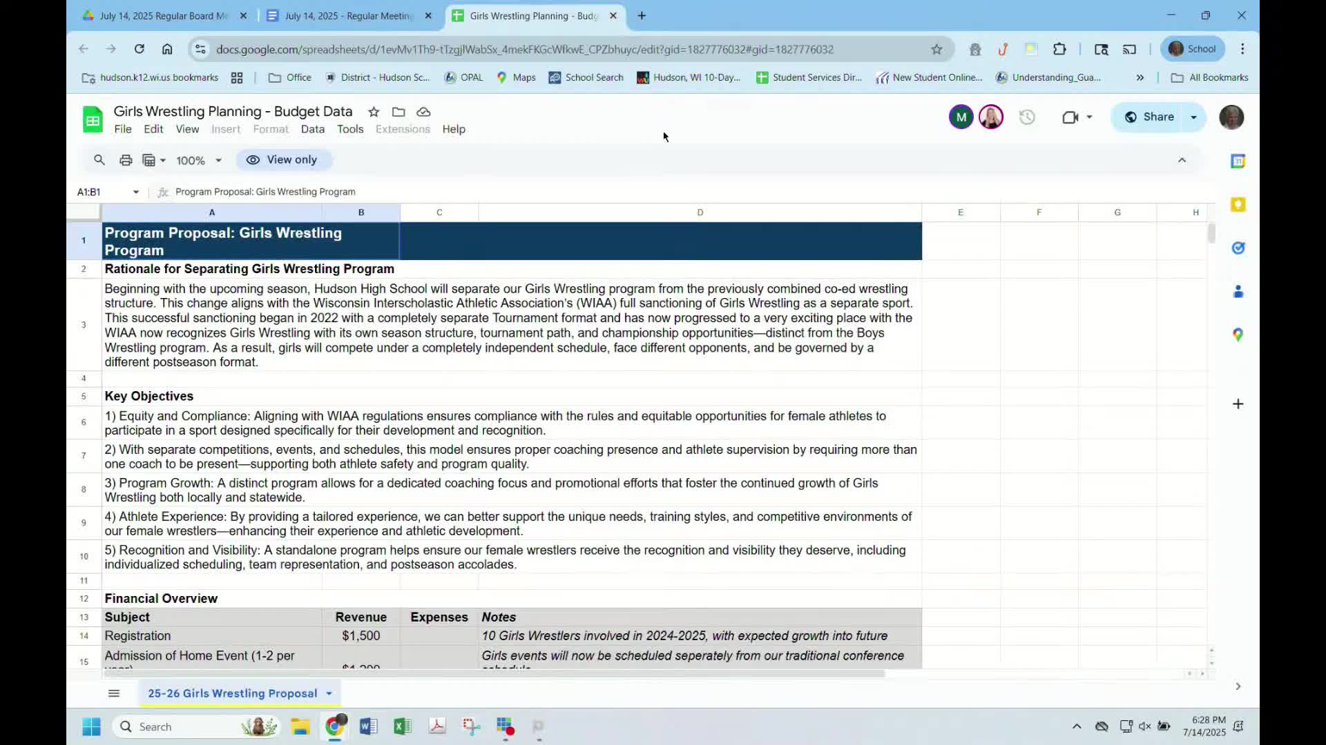 Board approves girls wrestling program and budget; discussion on coach staffing and transportation needs