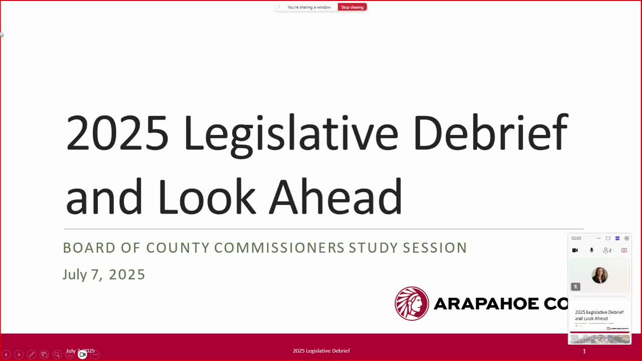 Arapahoe County legislative debrief: staff summarize 2025 session; board asks staff to research domestic‑violence housing options and advances a political‑viole