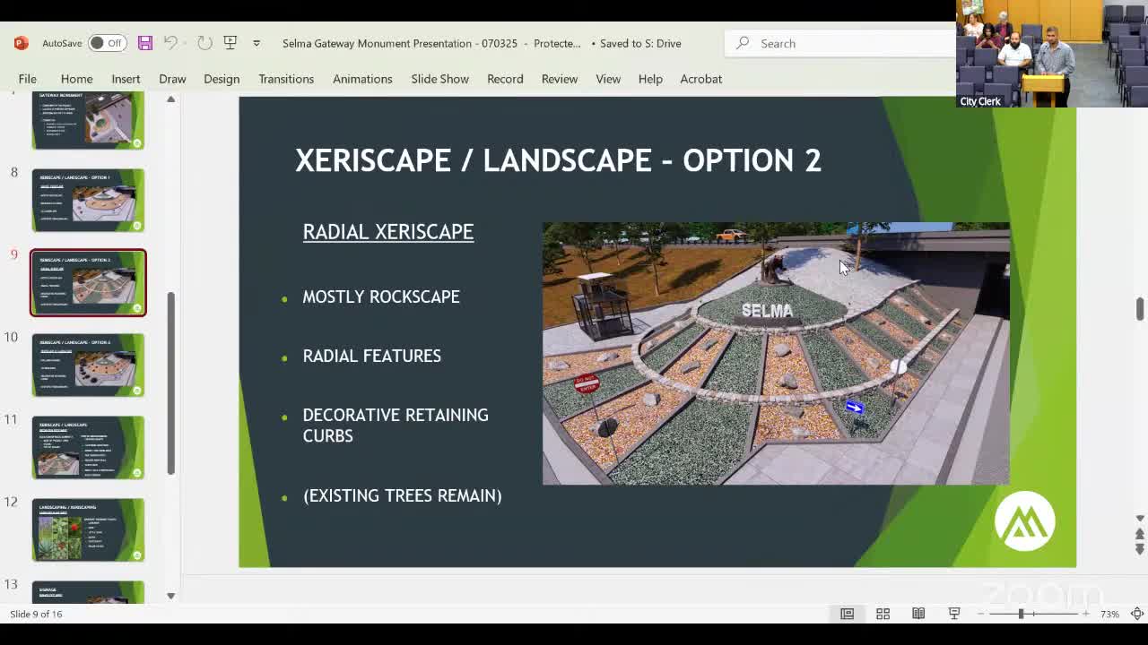 Clean California grant team shows Second Street gateway options; council favors radial rockscape and municipal seal