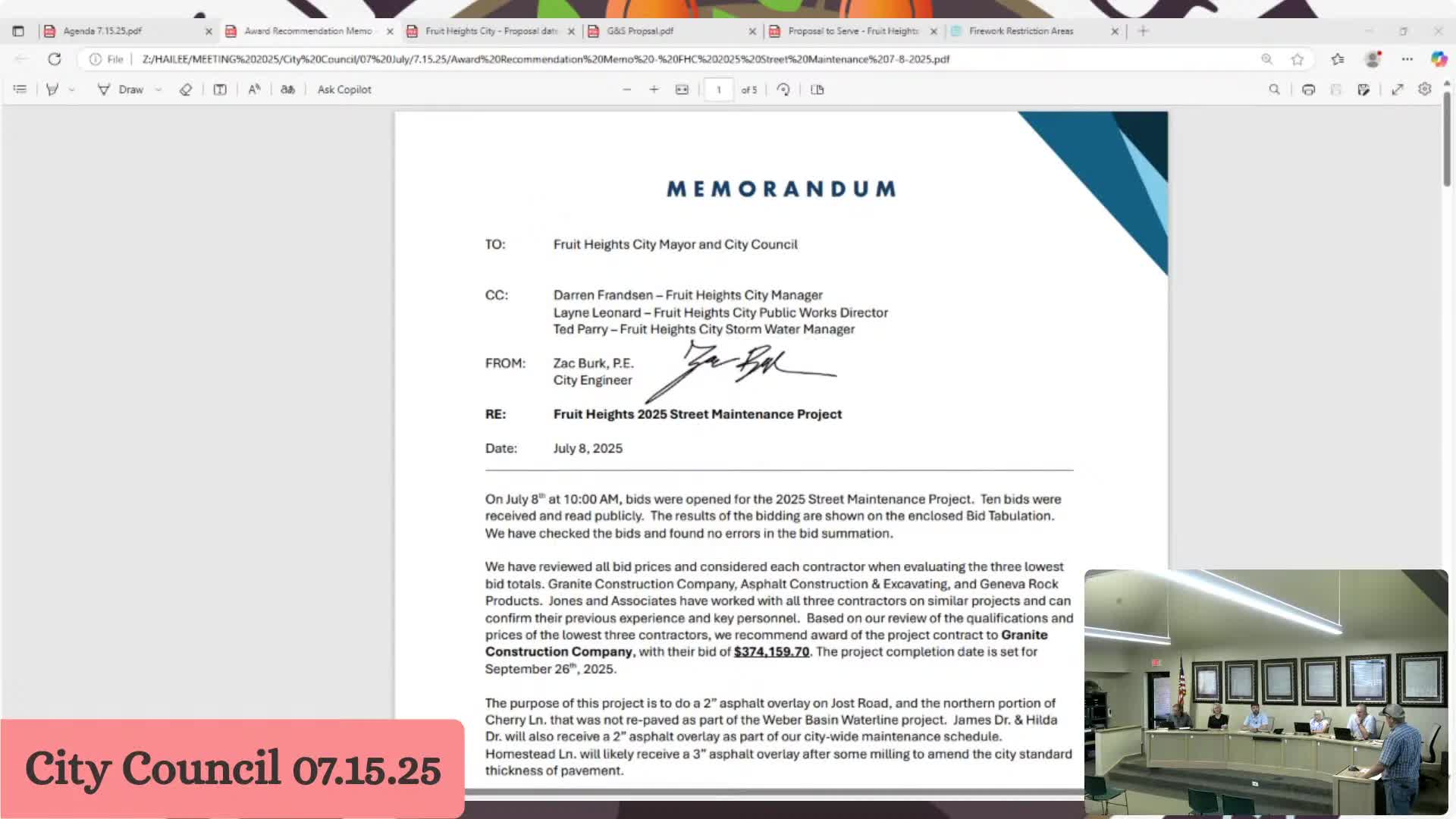 Council awards 2025 street-maintenance contract to Granite Construction for $374,159.70