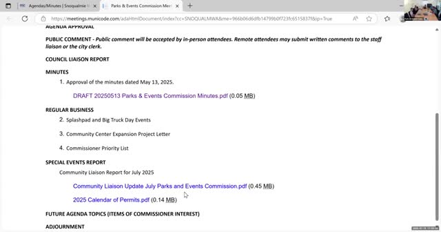 Snoqualmie Parks and Events Commission approves routine motions, excuses commissioner absence
