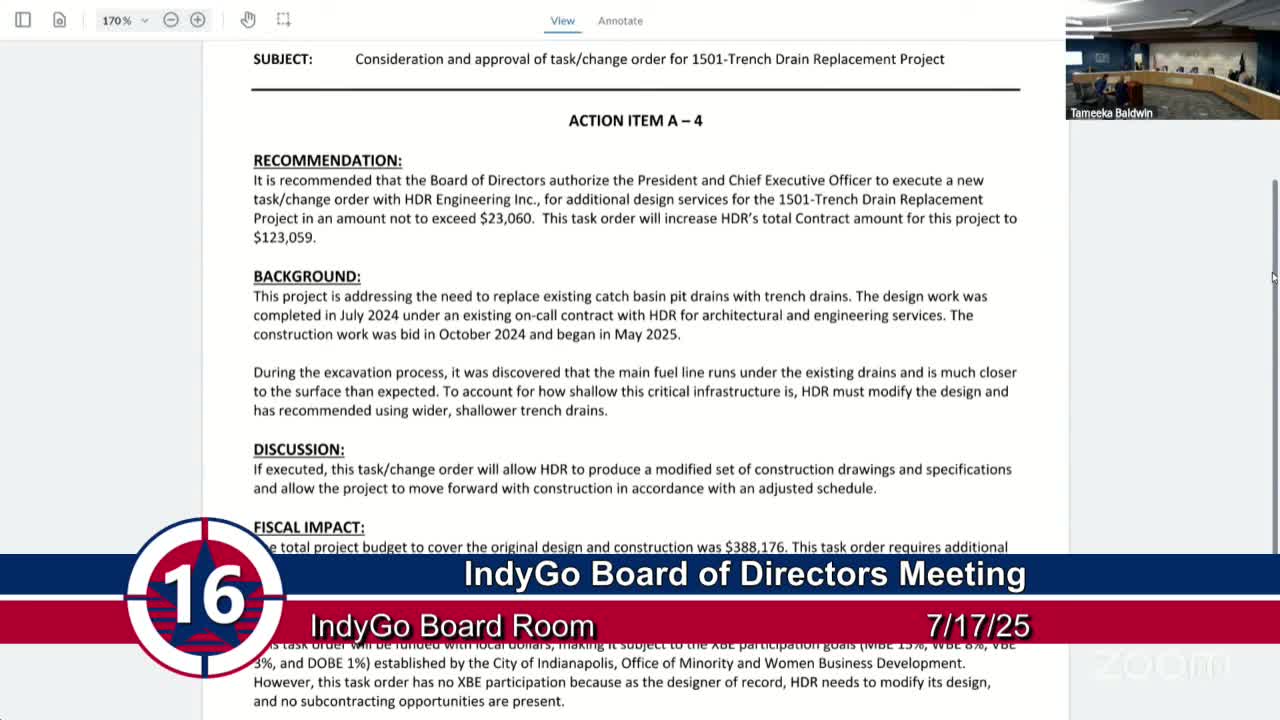 IndiGo authorizes $23,060 in additional design and environmental work for trench drain replacement