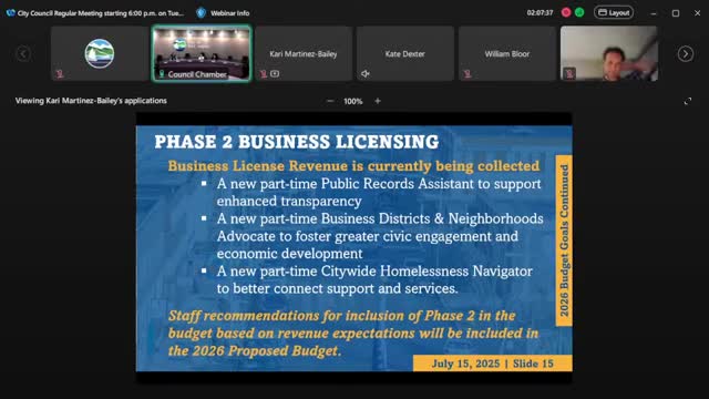 Council pauses on Phase 2 business-license hires; staff to hold placeholder and return during budget work sessions
