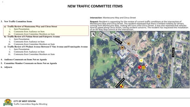 West Covina traffic panel denies all‑way stop at Montezuma Way and Citrus Street, recommends sign and curb work