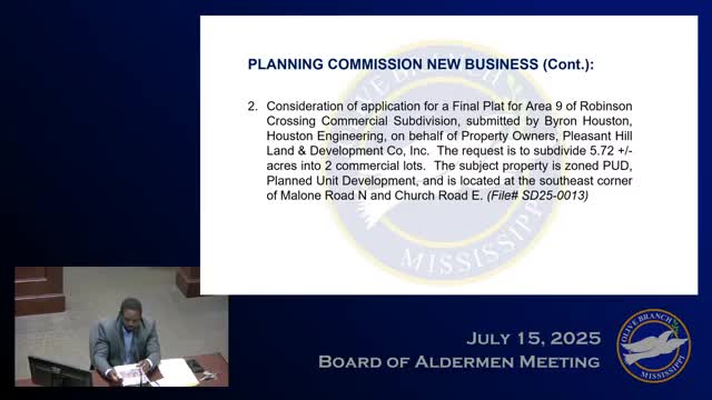 Olive Branch board approves final plat for Robertson Crossing Area 9 to preserve vested convenience-store rights