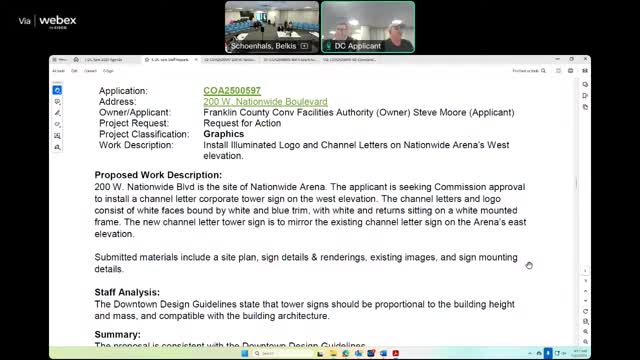 Nationwide Arena seeks matching channel‑letter tower sign on west elevation; commission hears presentation