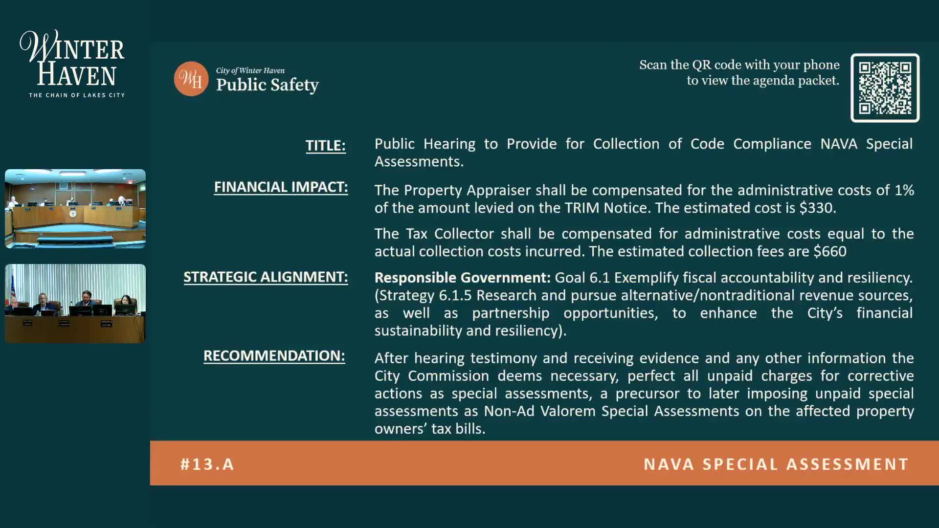Commission schedules public hearing to assign code-compliance costs as non‑ad valorem assessments