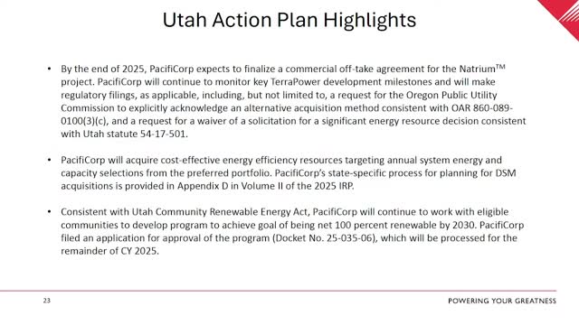 Utah action items in Pacificorp IRP include Natrium commercial agreement, community renewables RFP, efficiency commitments