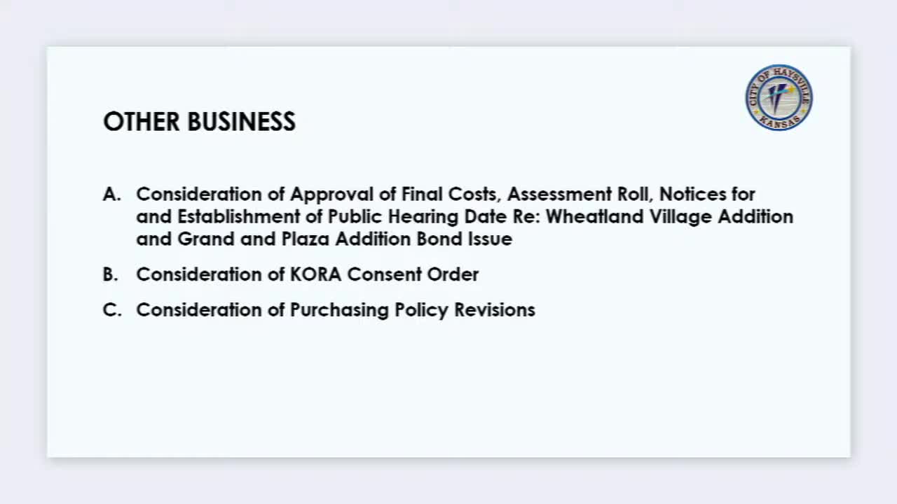 Haysville schedules July 14 hearing on special assessments for two subdivisions; bond sale planned for September