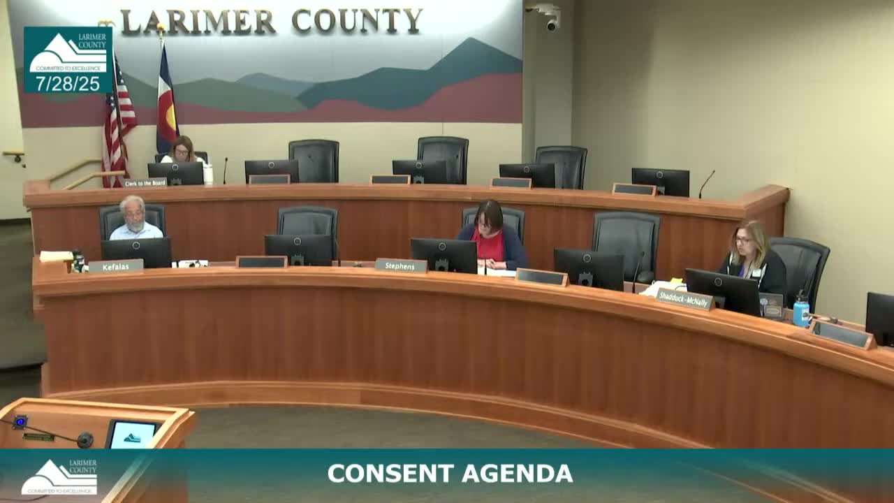 Votes at a glance: consent agenda approved (Novak rezone; Estes Valley code amendments; Dickey & Petacord short-term rental)