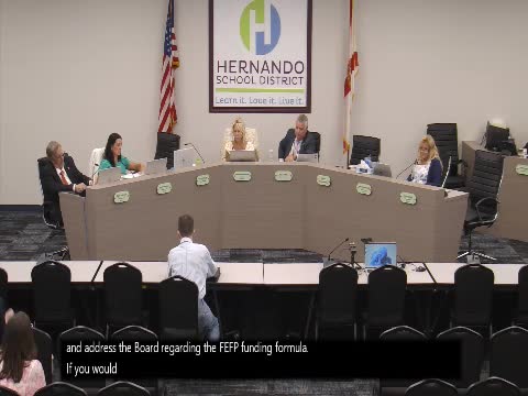 Resident urges district to press state on FEFP compression; district to meet with DOE and consultants