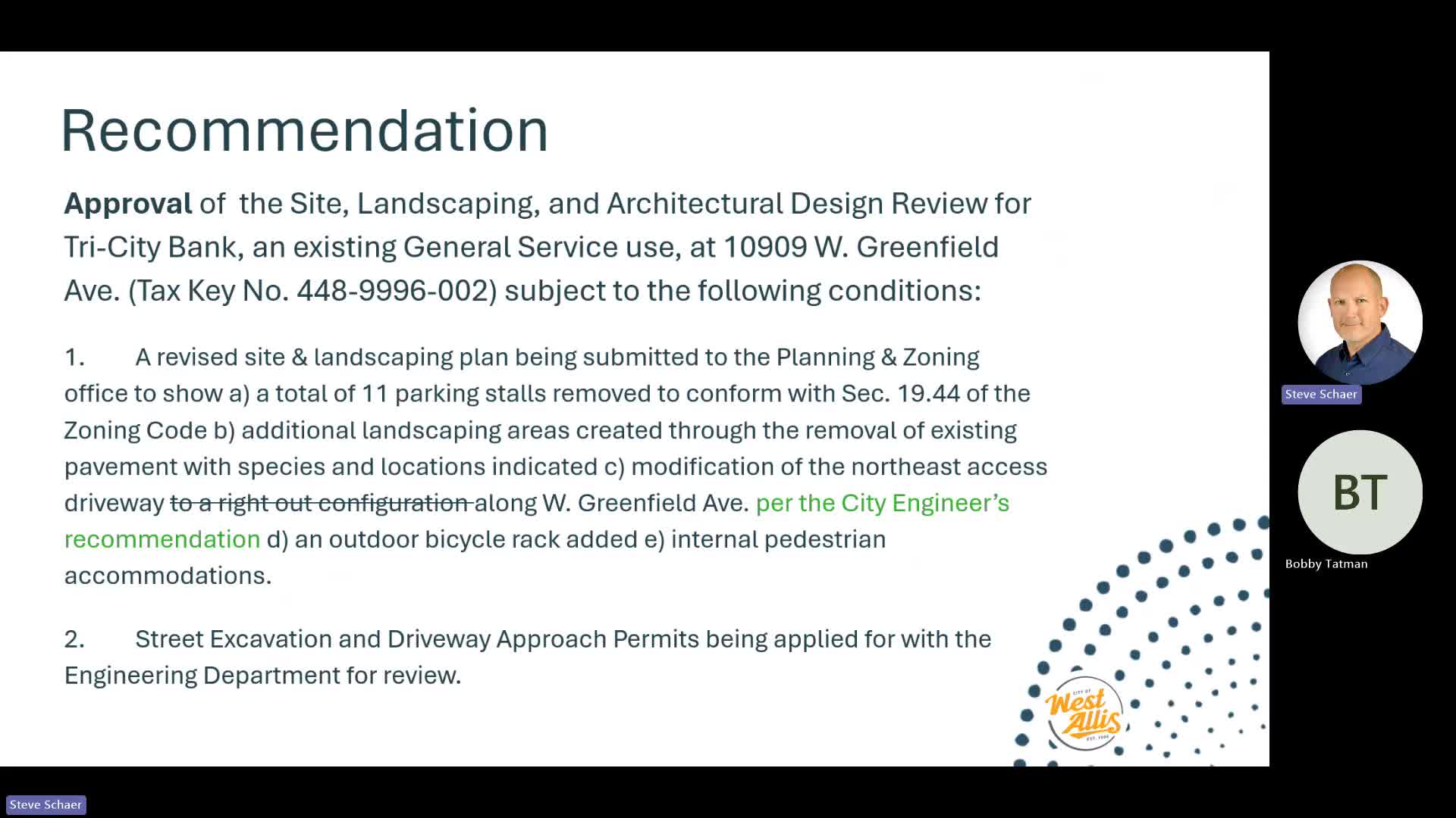 Plan commission approves Tri City Bank parking replacement with conditions to reduce excess stalls and revise northeast access