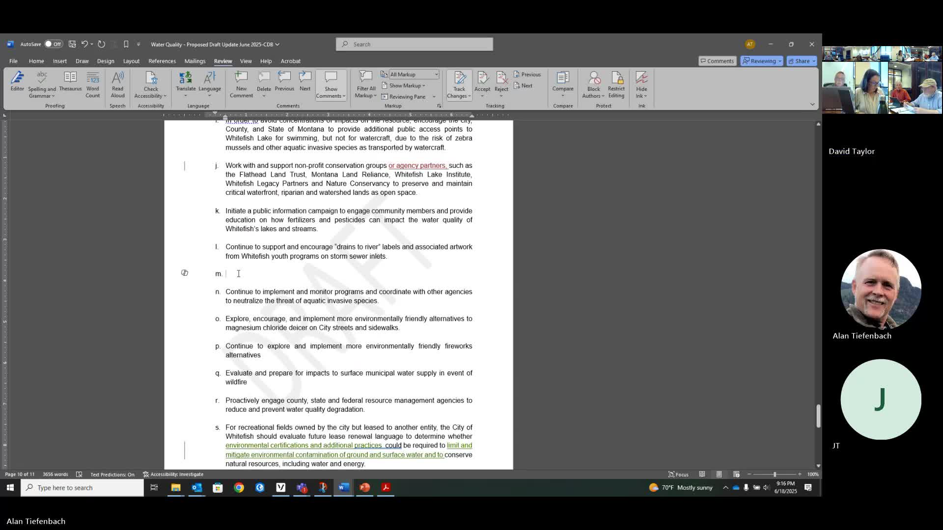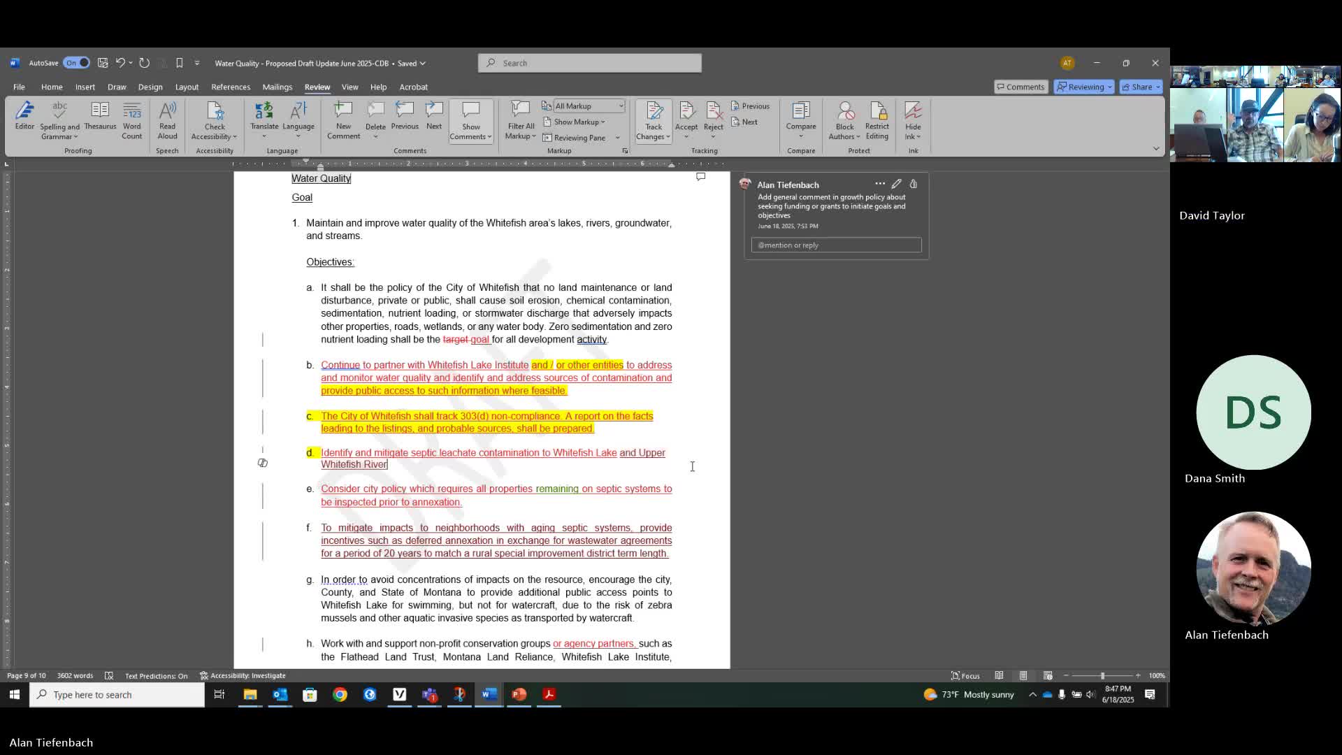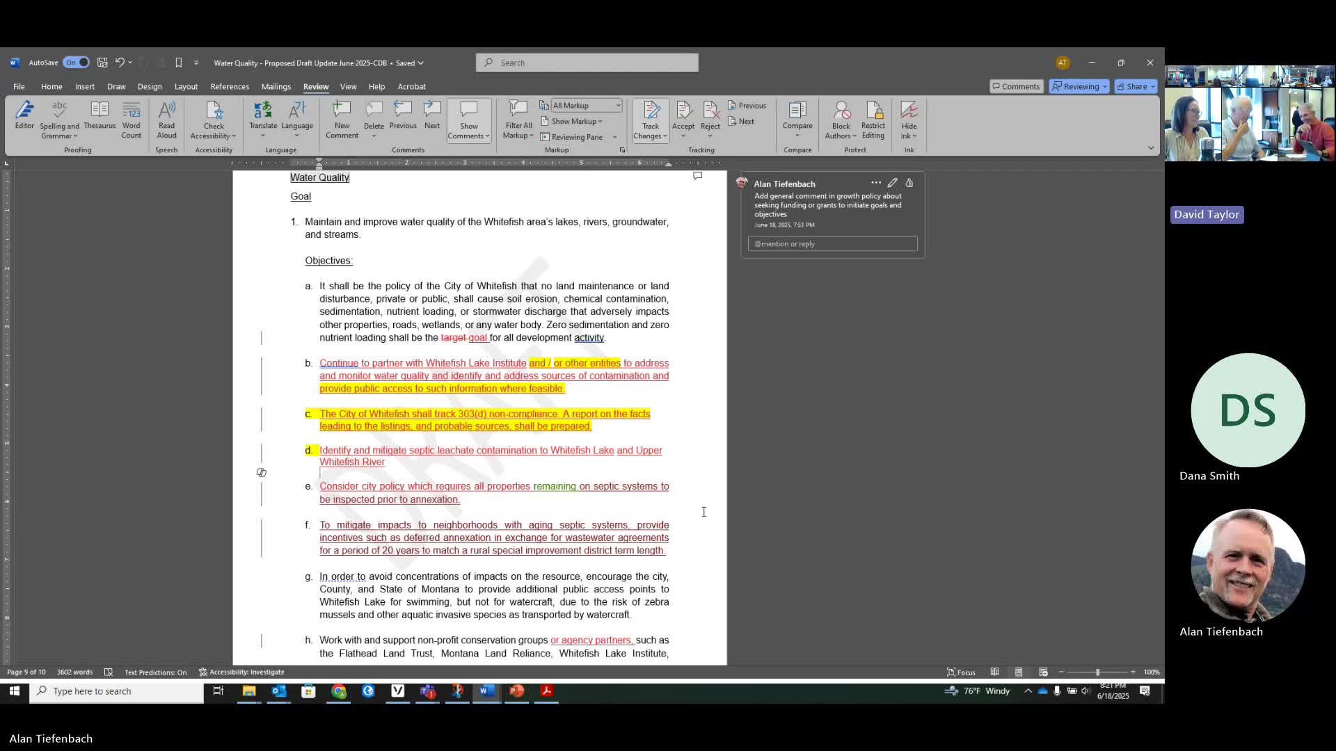 Planning session adds periodic water-quality reporting objective; septic inspection authority debated