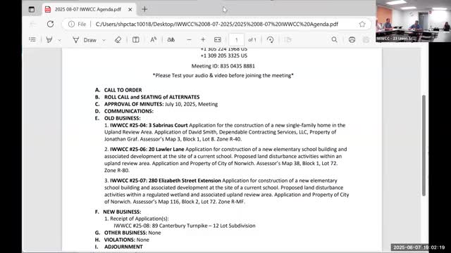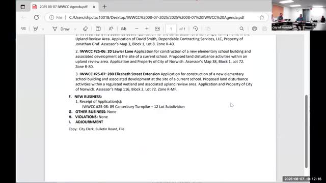 Norwich IWWCC accepts 12‑lot Canterbury Turnpike subdivision application, schedules site walk