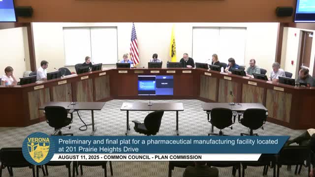 Council approves preliminary/final plan for pharmaceutical facility at 201 Prairie Heights Drive with noise screening contingency