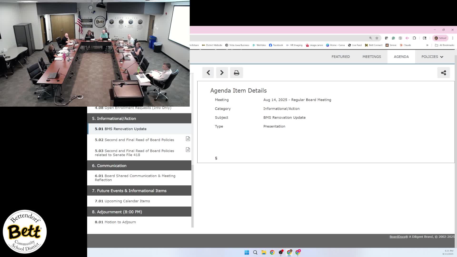 Board approves agenda, consent items and policy 5.02; tables policy 5.03 to next meeting