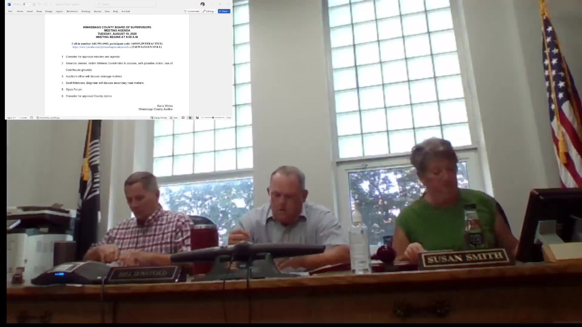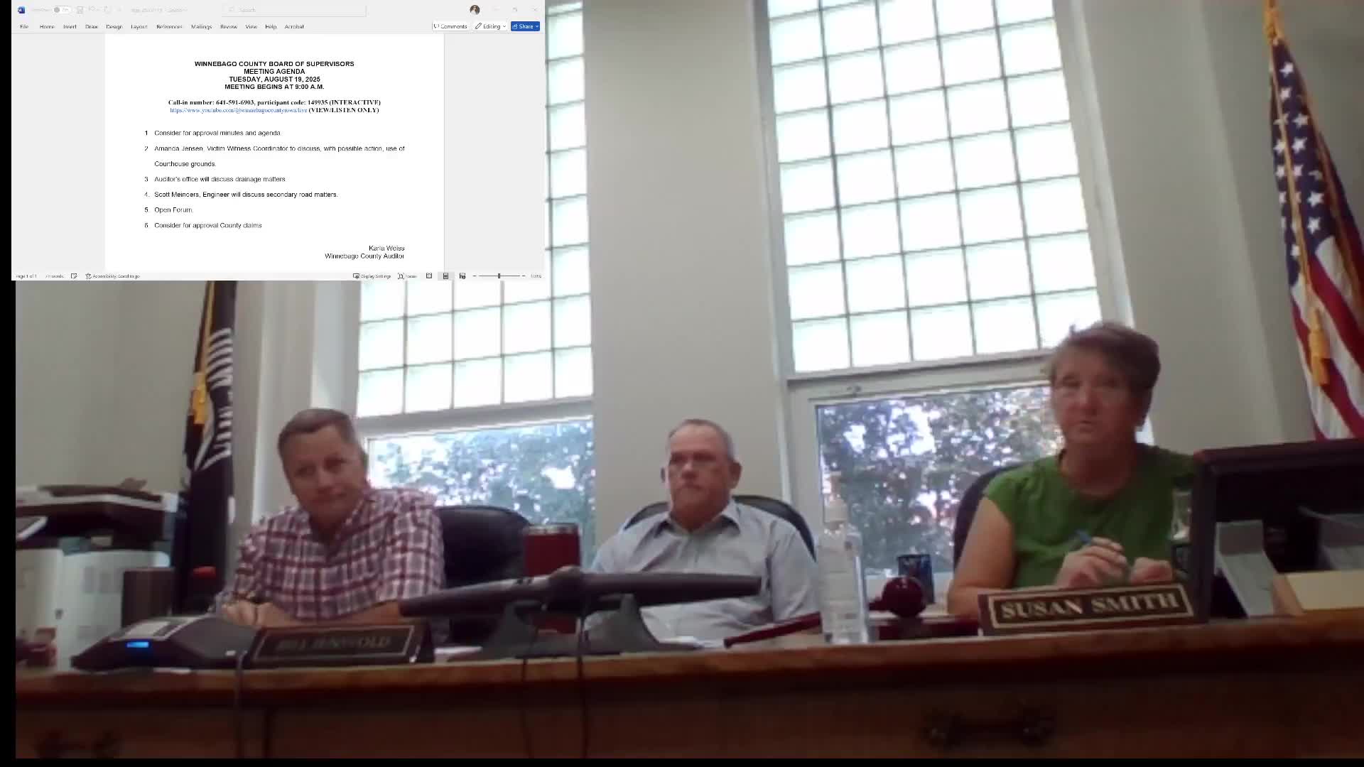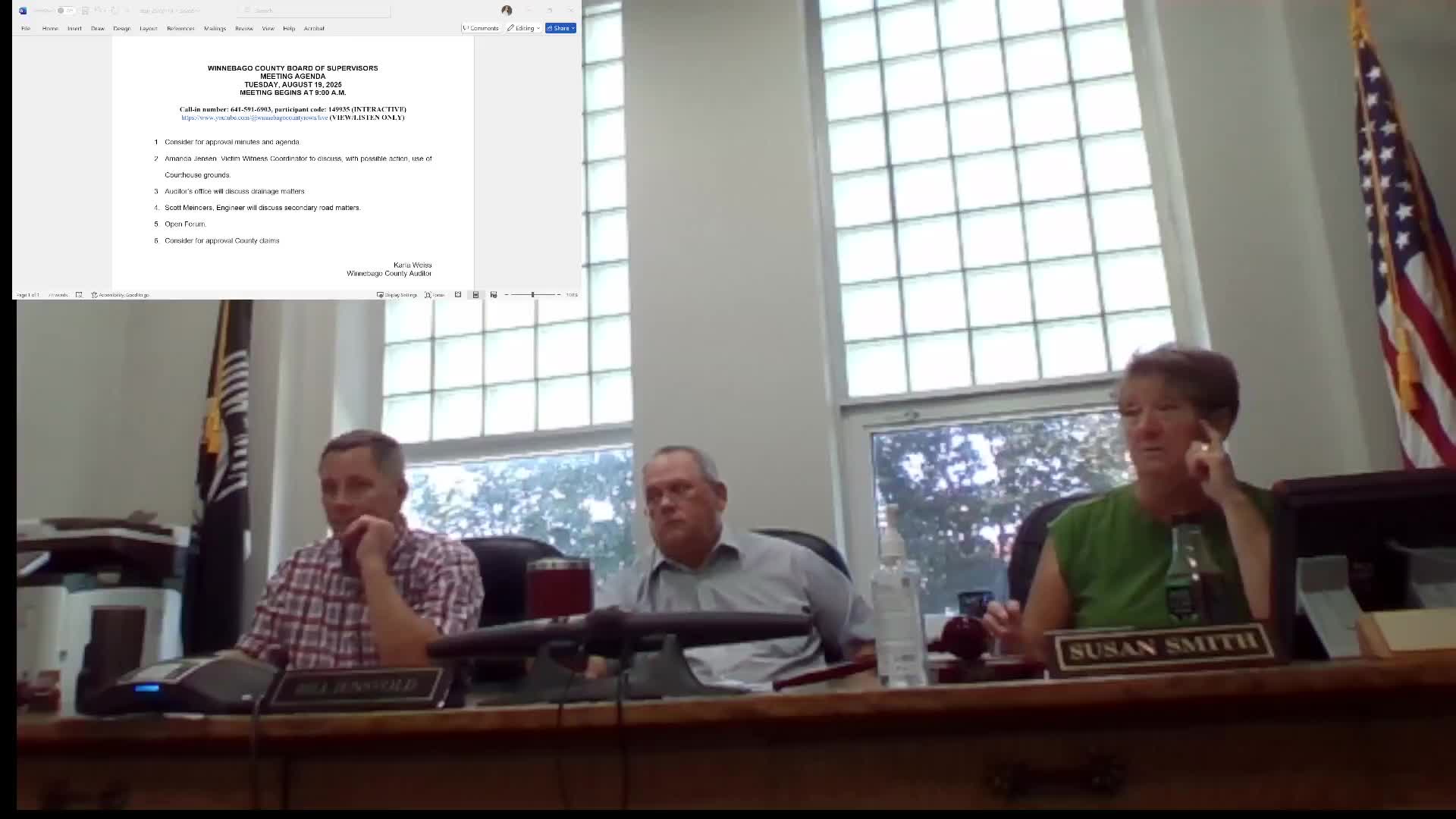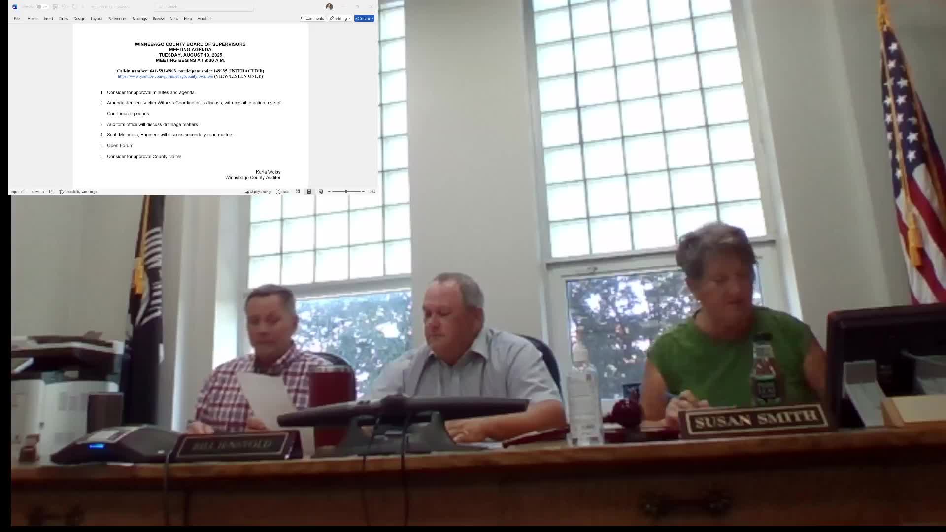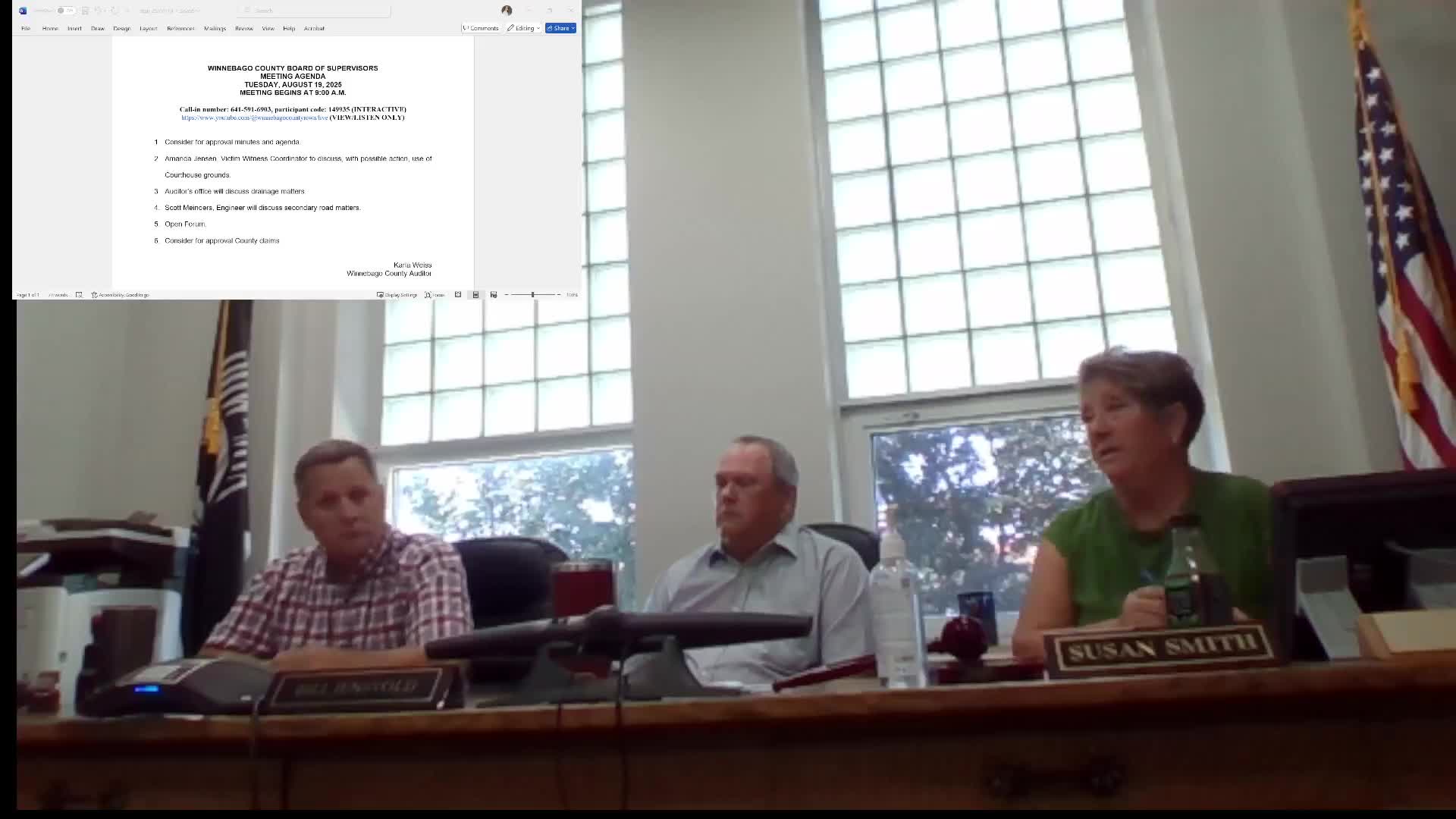 Votes at a glance: board approves agenda, authorizes courthouse displays, and approves county claims
