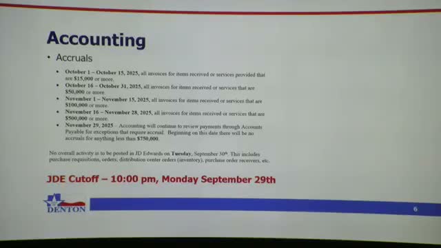 Denton City finance and procurement staff set year‑end deadlines, explain accruals and procurement changes