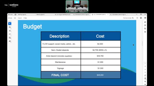 Commission approves one‑week eco‑sculpture residency and performances for ArborFest with requirement to return with recap