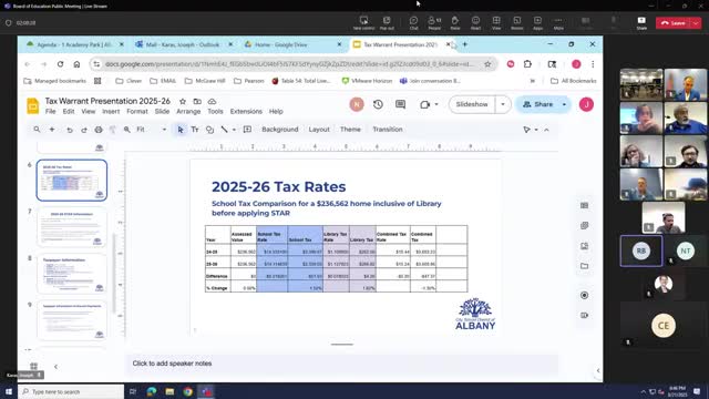 Albany City School District board adopts 2025–26 tax warrant; overall levy rises about 1.13%