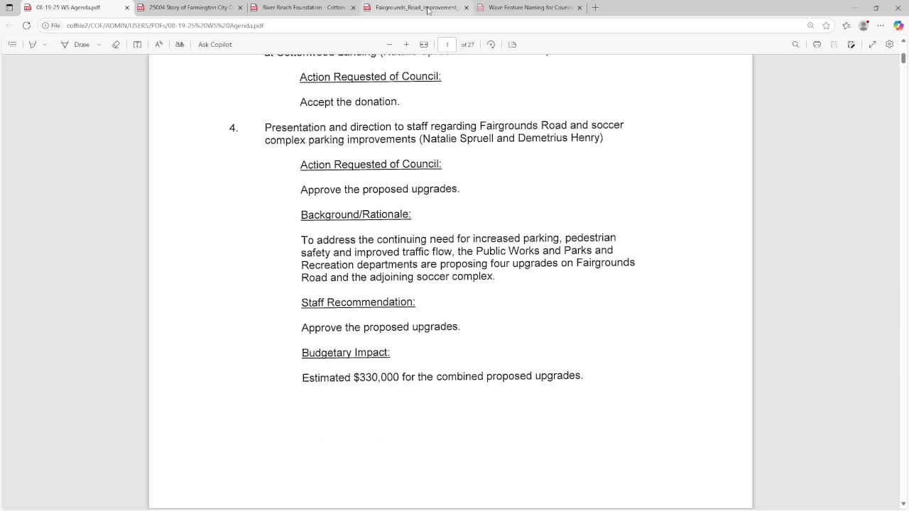 Council backs upgrades to Fairgrounds Road and soccer-complex parking; staff to return with budget adjustment