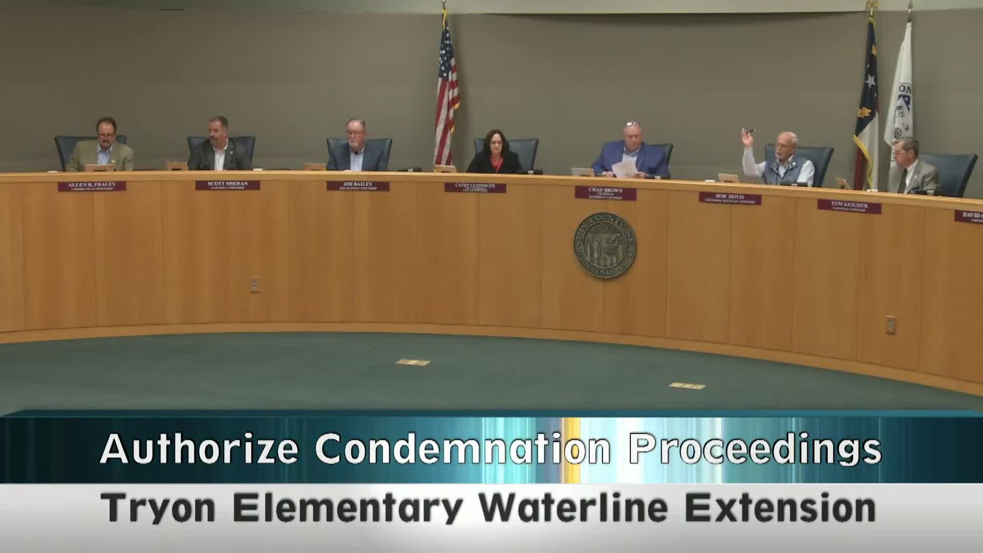 Commissioners authorize condemnation for Tryon Elementary waterline easement after majority vote