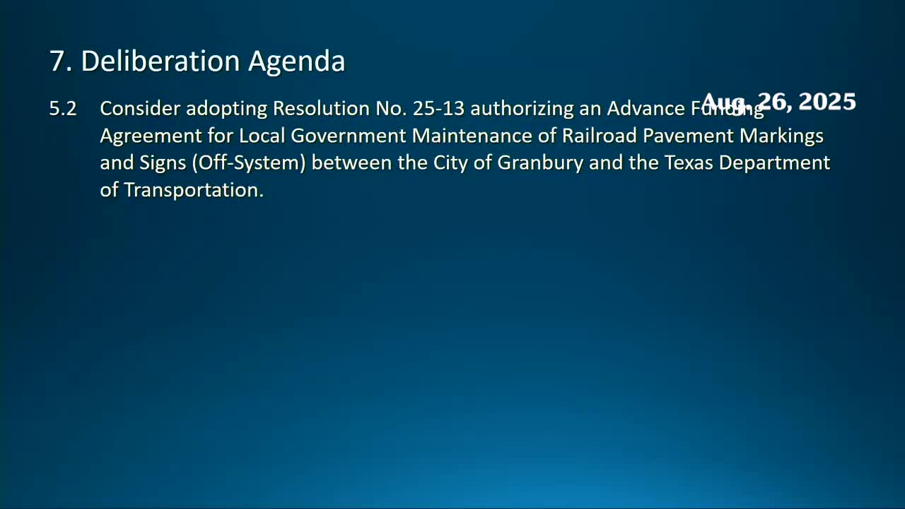 Granbury council adopts resolution with TxDOT to install and maintain railroad-crossing signs and pavement markings (Res. 25-13)