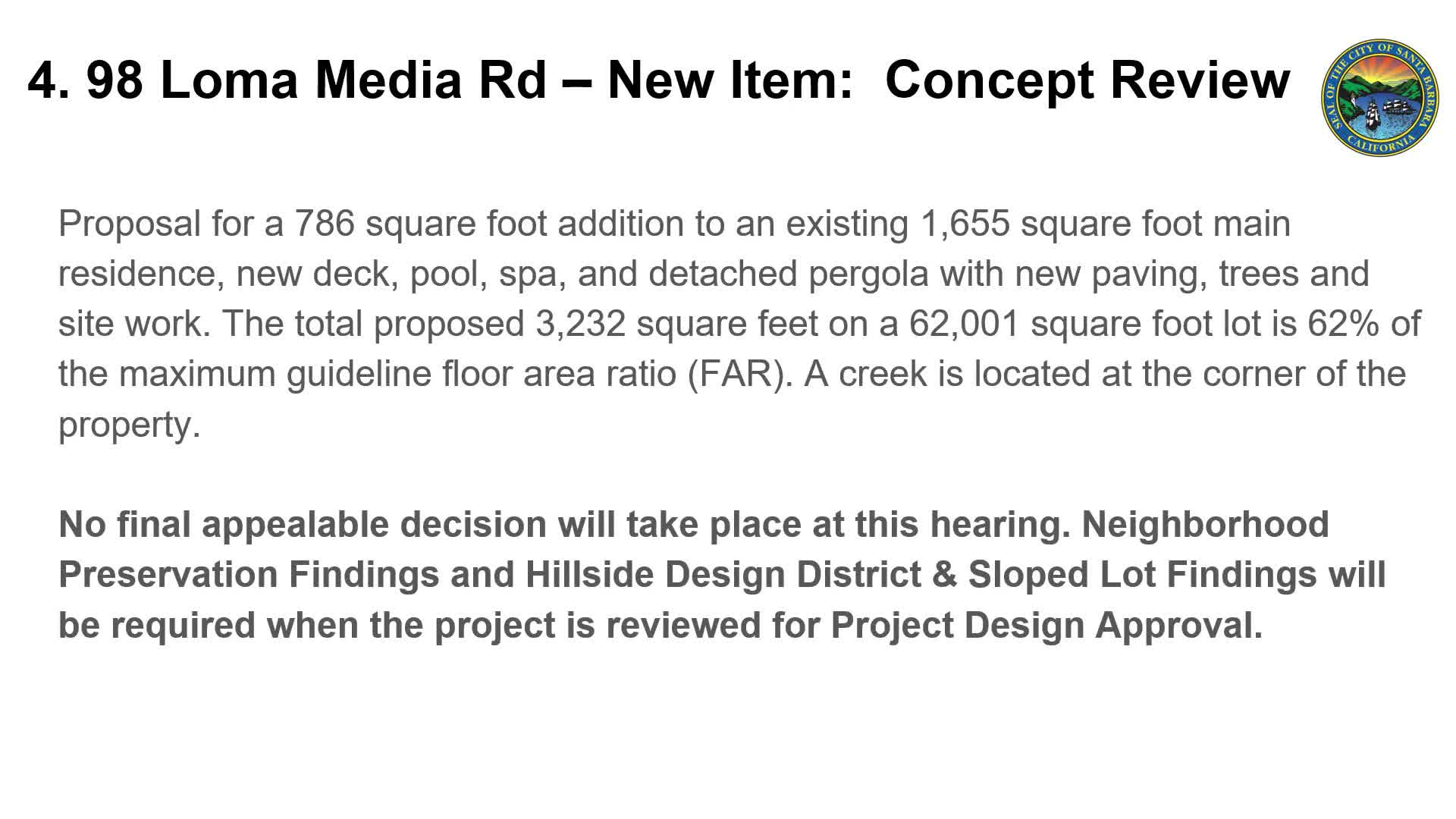 Board supports Loma Media addition concept, asks for pool‑wall and material details; signals support for driveway gate exception
