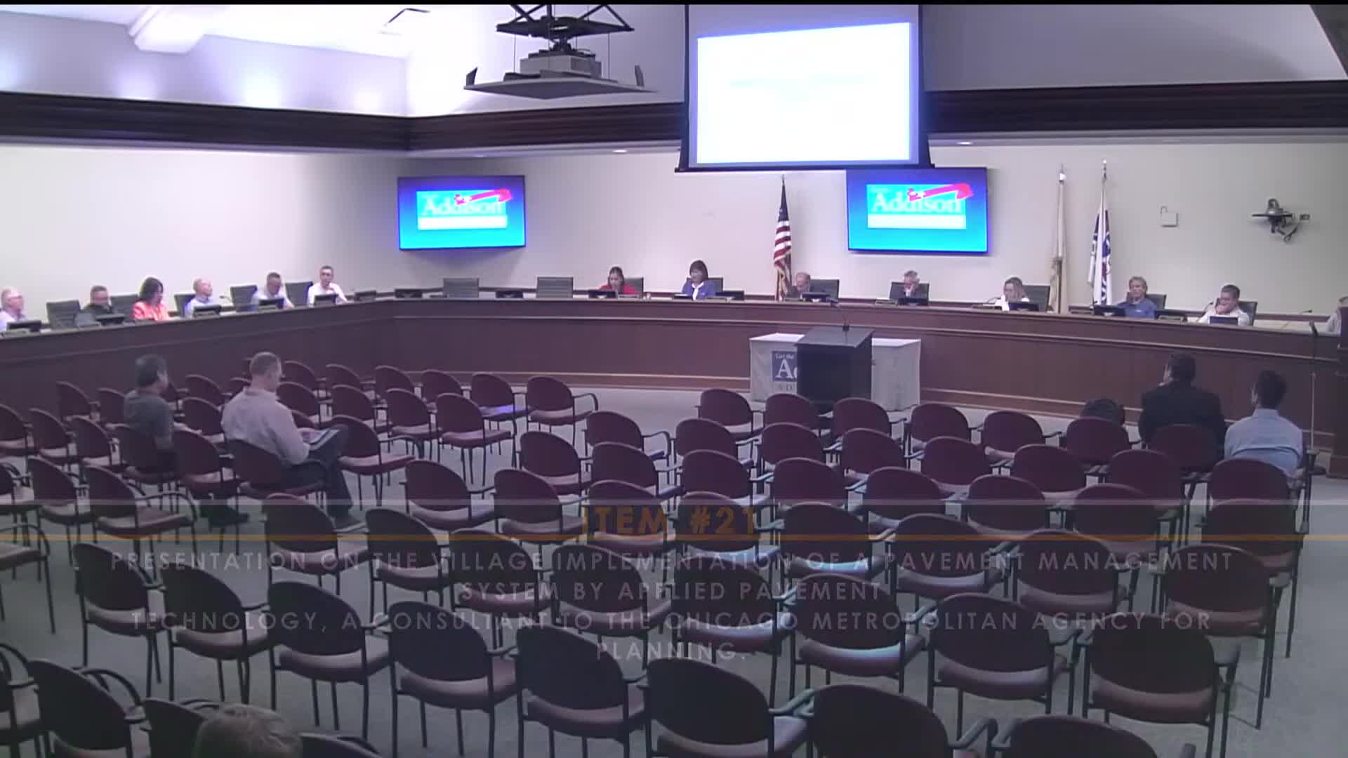 CMAP and Applied Pavement Technology present PAVER analysis showing Addison’s network PCI at 65; staff urged to maintain preservation funding