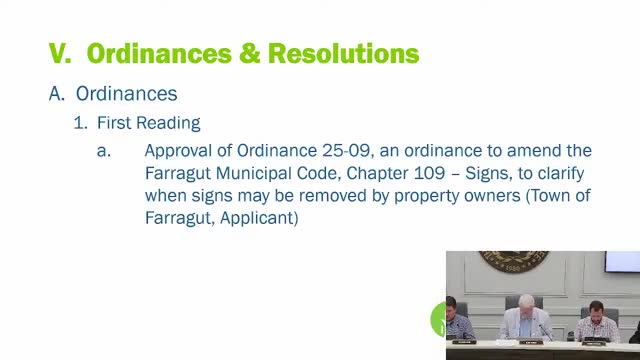 Farragut approves first reading of sign‑ordinance amendment clarifying public right‑of‑way