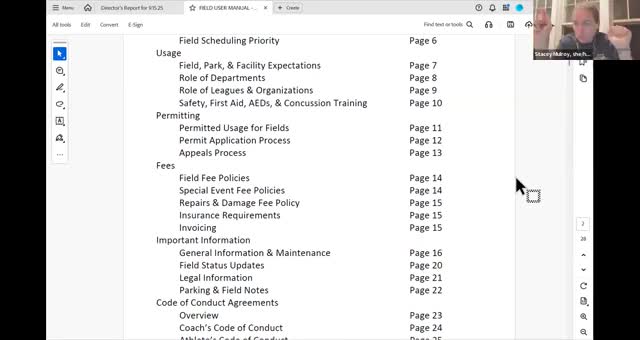 Director reports rising fall program revenue, near-complete court work and Claxton sod concerns amid drought