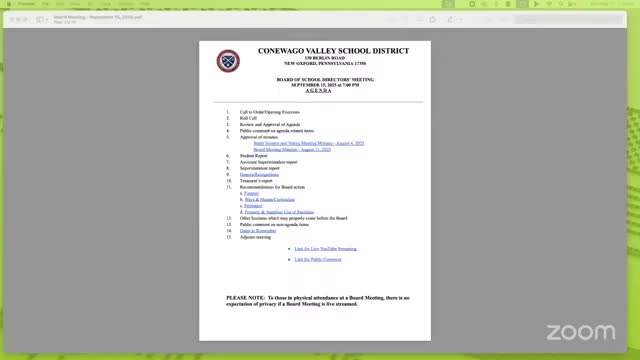 Conewago Valley School District board approves agenda, minutes, finance, personnel and facilities items
